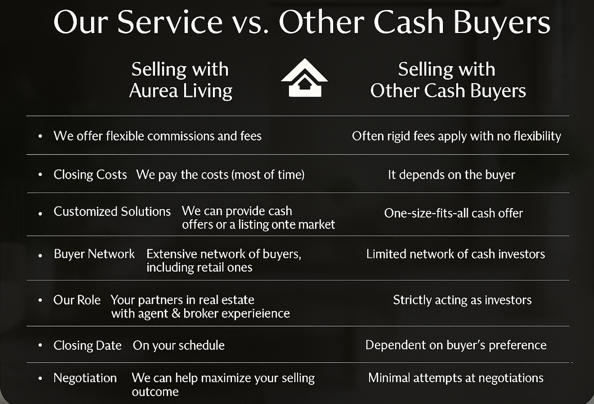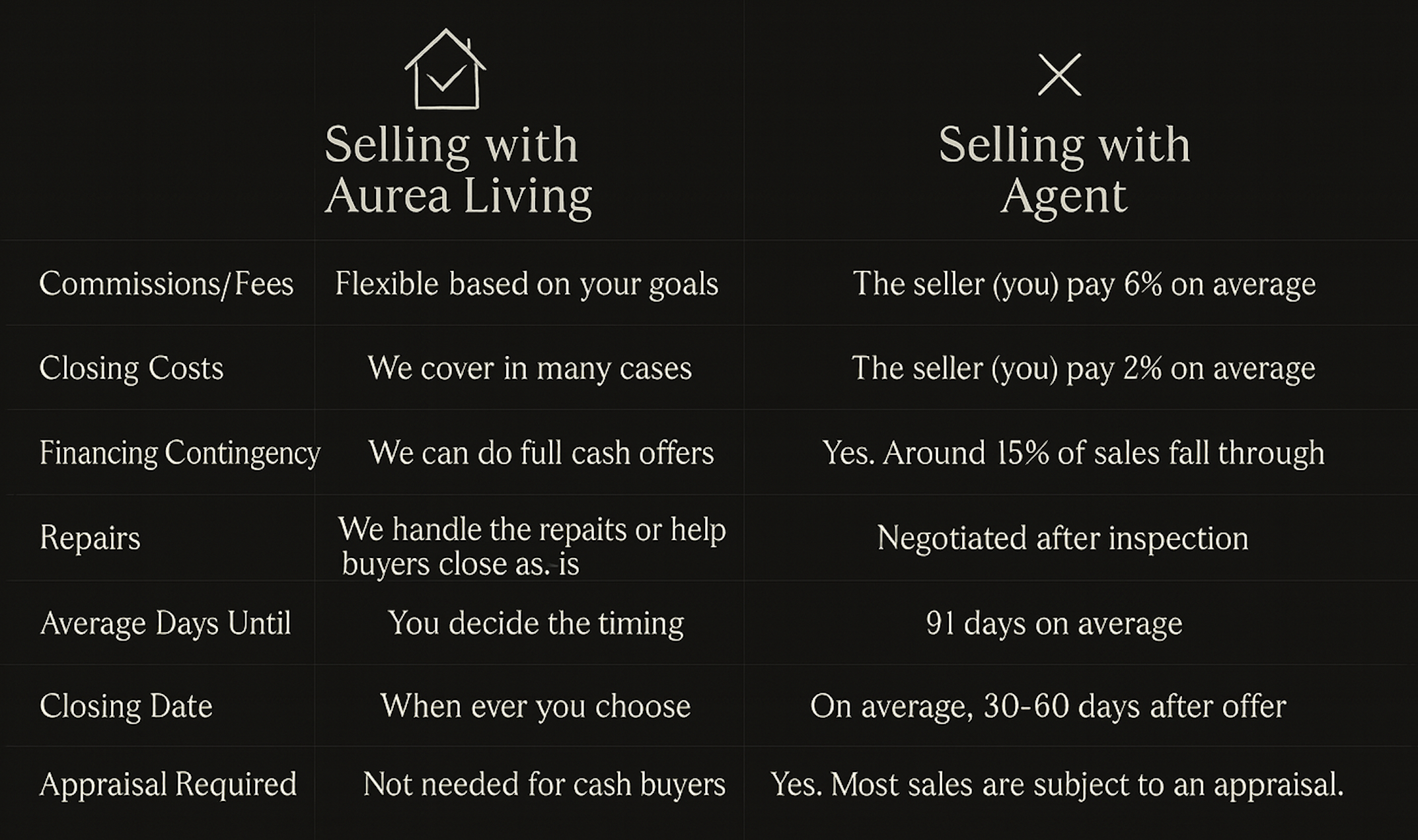 No matter what life or property challenge you’re facing, Aurea Living Co. can help you sell your home as-is — quickly, easily, and on your terms. We buy houses in any condition, and let you choose the closing timeline that works best for you.